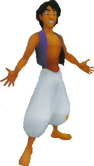 Aladdin: Aladdin is a thief living on the cruel streets of Agrabah. He has fallen in love with the Princess Jasmine and will do anything for her.When she is kidnapped by the evil Jafar he joins Sora to defeat the evil Visier and save the princess. Little does he know that he is about to become wrapped up in saving his world. Voice Actor: Scott Weinger First appearance in the Disney world: Aladdin (1992)