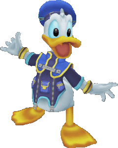 Donald: Donald is the Royal Wizard, quick to anger and jump to conclusions. Donald will fight when provoked and strike back twice as hard using his powerful magic. When he is ordered by the King to find the Keyblade Master he and Goofy leave on a quest to find him, Sora. At first Sora and Donald argue a lot, but soon they realize that they rely on each other and a friendship develops. With Sora and Goofy, Donald is a member of a trio of true friends and powerful warriors. Voice Actor: Tony Anselmo First appearance in the Disney world: The Wise Little Hen (1934)