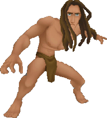 Tarzan: Tarzan is a powerful warrior of the jungle. Tarzan was lost in a jungle as a child and was raised by gorillas. He has taken on theattitudes and fighting styles of his adopted family and has grown to be a powerful defender of the jungle. He is slow to anger but when he does get mad,stay out of his way. Recently he met Jane and Clayton, two members of an expedition to explore the jungle. He doesn't trust them fully but he is quicklylearning what it is to be a human, what he truly is. When Sora and friends show up his world is turned upside down and he joins them to save his home. Voice Actor: Tony Goldwyn First appearance in the Disney world: Tarzan (1999)