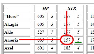 For example: If you want to know how Ameria's Strength matches to the other Stars, Just follow the chart to find her strength (as in red above). The number to the right of that (underlined in green above) tells you the rating of that stat. In this case, her STR is ranked 5. That means that her STR are about average. If the number were 1, that would mean that she had the highest strength. If the number in green were a 10, that would mean that she had the lowest strength. |